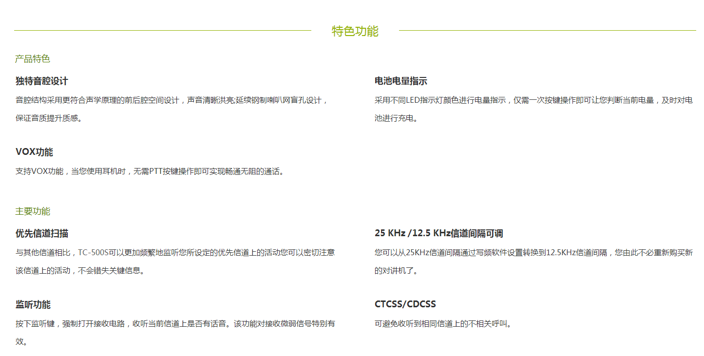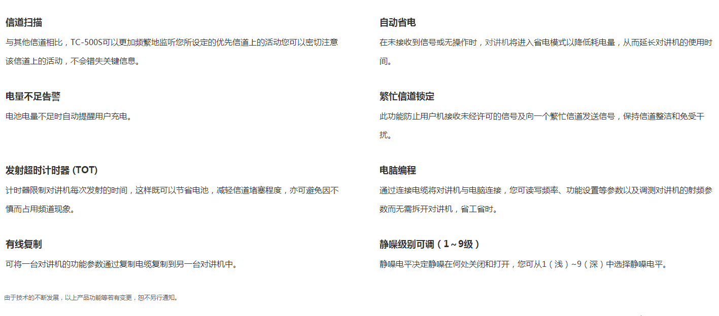 TC-500S是一款高品質商用對講機。符合美國軍标,1.5米防損抗跌落結構,堅固耐用。獨特的音腔結構設計,高保真、清晰的語音質量。配備(bèi)大容量锂電池,可提供長(zhǎng)時間的優質表現。外觀小巧、專業,符合人體工學原理,掌握舒适。搭配舒适的VOX耳機,TC-500S,爲商業用戶提供高品質的通訊體驗。