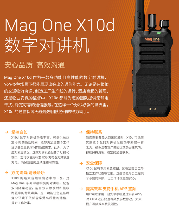 Mag One X10d 作爲一款多功能且高性能的數字對講機,它在多種場(chǎng)景下都能展現出突出的通信能力。無論是在繁忙的交通物流協調、制造工廠生産(chǎn)線的運轉、酒店商超的管理還是物業安保的監督中,X10d都能爲您的團隊提供無靜電幹擾、穩定可靠的通信服務。在這樣一個分秒必争的世界裏X10d 的通信保障無疑是您團隊協作的得力助手。